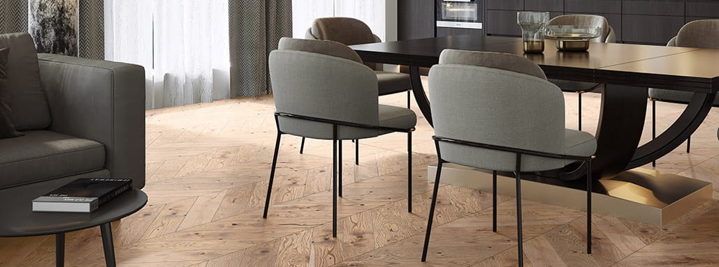 Podłoga drewniana o mocno podkreślonej szczotkowaniem strukturze, z dużą ilością naturalnych cech drewna. Szlachetności deskom nadała 4-stronna mikrofaza. Podłoga barwiona na odcień beżowo-popielaty, wykończona lakierem matowym.
